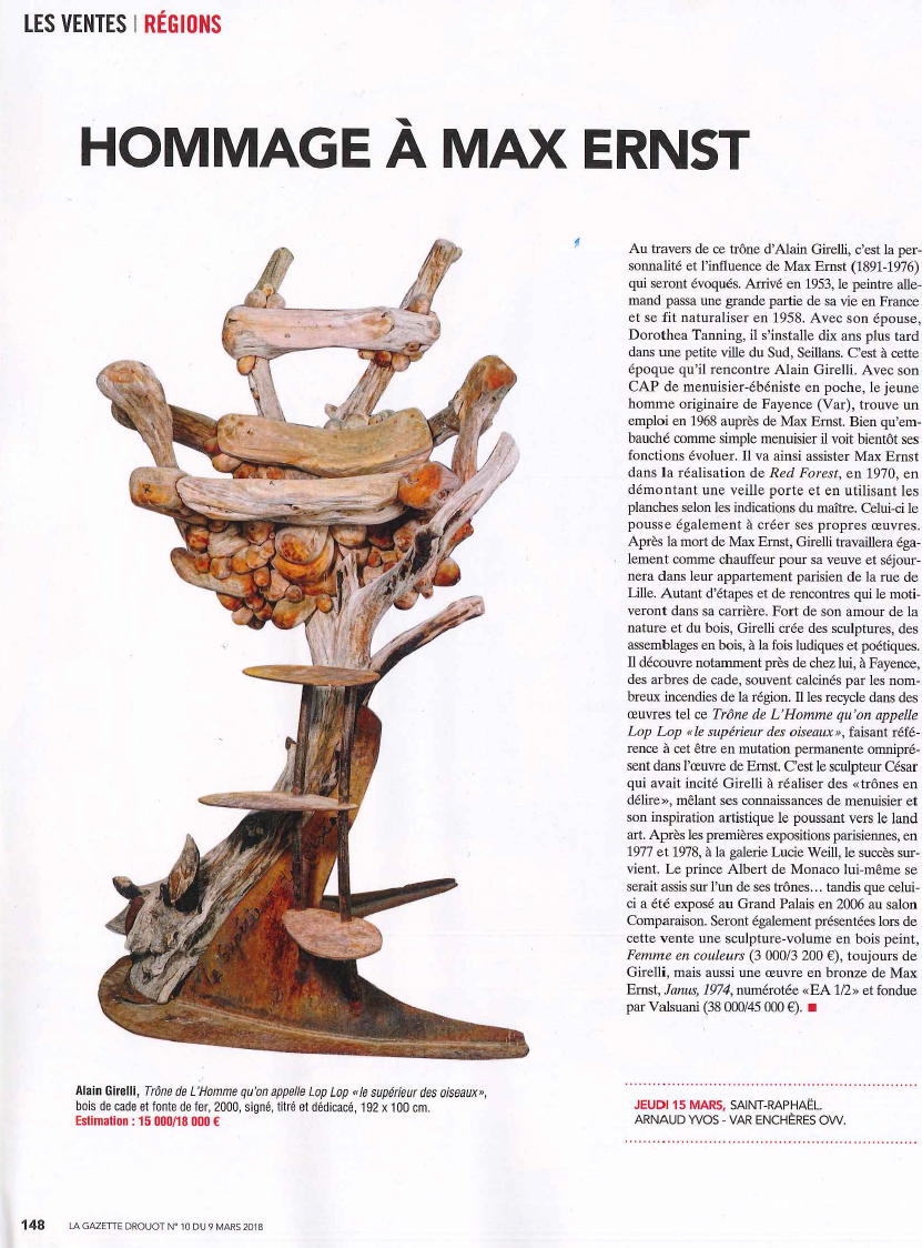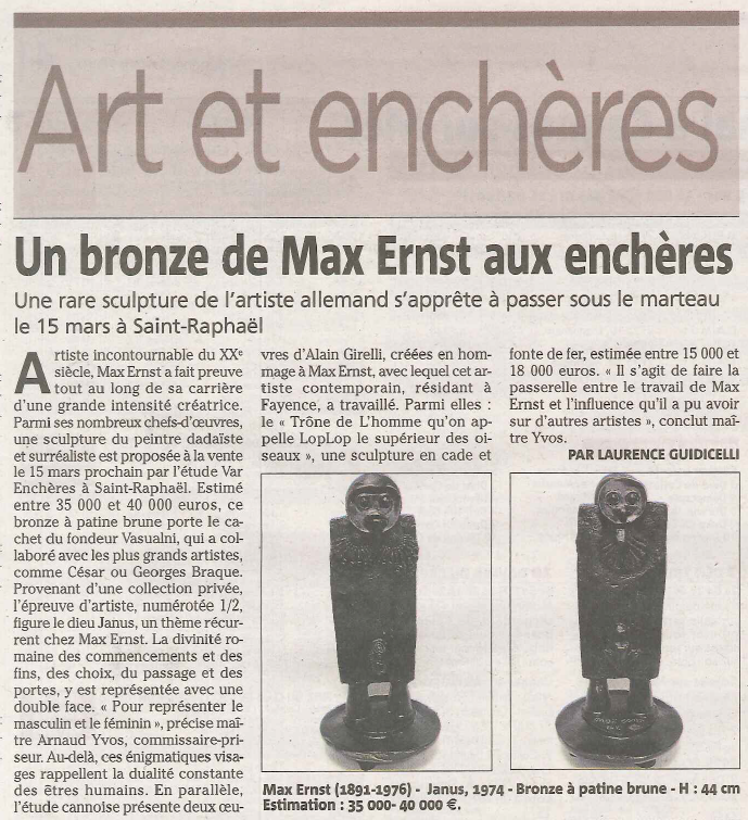 Arts et Enchères, 11 mars 2018 : « Un bronze de Max Ernst aux enchères »